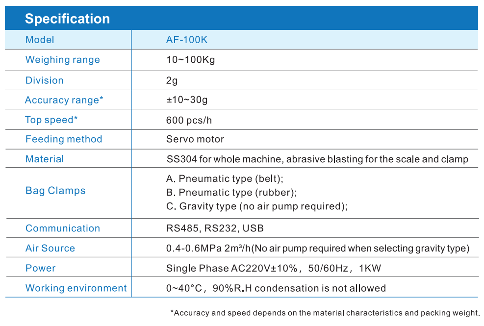 General Measure's Gross Weigher AF-100K is suitable for packing 10-100kg of free-flowing granular materials. The whole body is made of robust SS304 stainless steel. It has a servo motor feeding control and is high-accuracy, fast-speed, stable, and durable.